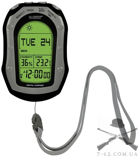 Електроннацифрова портативна Метеостанція La Crosse WTK28-GREY | 920771оснащена альтиметром (висотаміром), символьним барометричним прогнозом погоди, цифровим компасом, термометром і датчиком відносної вологості. Призначена для любителів активного відпочинку на природі та в горах, мисливців та рибалок.