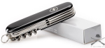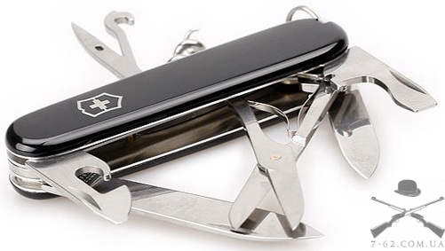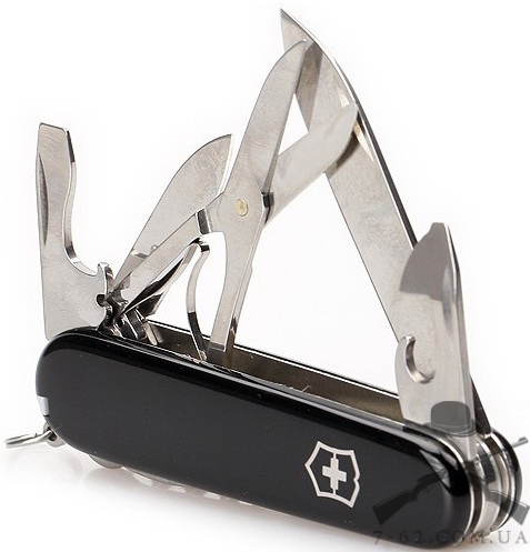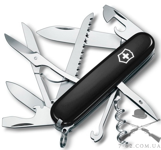 Швейцарський офіцерський ніж Victorinox Huntsman 1.3713.3 – унікальний, високоякісний швейцарський ніж. Містить добре ріжучу пилку. Інструмент зріже гілки та розпиляє дерево невеликого розміру. При цьому не клинить у деревині, що дуже важливо для більш легкої роботи. В арсеналі складного набору і чудово ріжучі великий і малий клинки. З ними Ви, безумовно, проробите всі необхідні роботи. За рахунок штопора, та спеціальних відкривачок для консервів та пляшок, Victorinox Huntsman 1.3713.3 виручить Вас у будь-якій подорожі. Тоді, як у ремонтах знадобляться пристосування для видалення ізоляції, а також шило та викрутки, які легко закручують та відкручують кріпильні вироби. Оснащена ексклюзивна модель і спеціальним багатоцільовим гачком, а також ножицями та пінцетом. Складаний ніж Victorinox Huntsman 1.3713.3 виготовлений із нержавіючої сталі з високоміцними пластиковими елементами на рукоятці. Тому, надійний та довговічний. Ніж виконаний у презентабельному дизайні із глянсовою рукояткою класичного чорного кольору. Завдяки цьому ножу будь-яка робота стане для вас задоволенням і для цього необхідно лише покласти ніж Victorinox в кишеню!