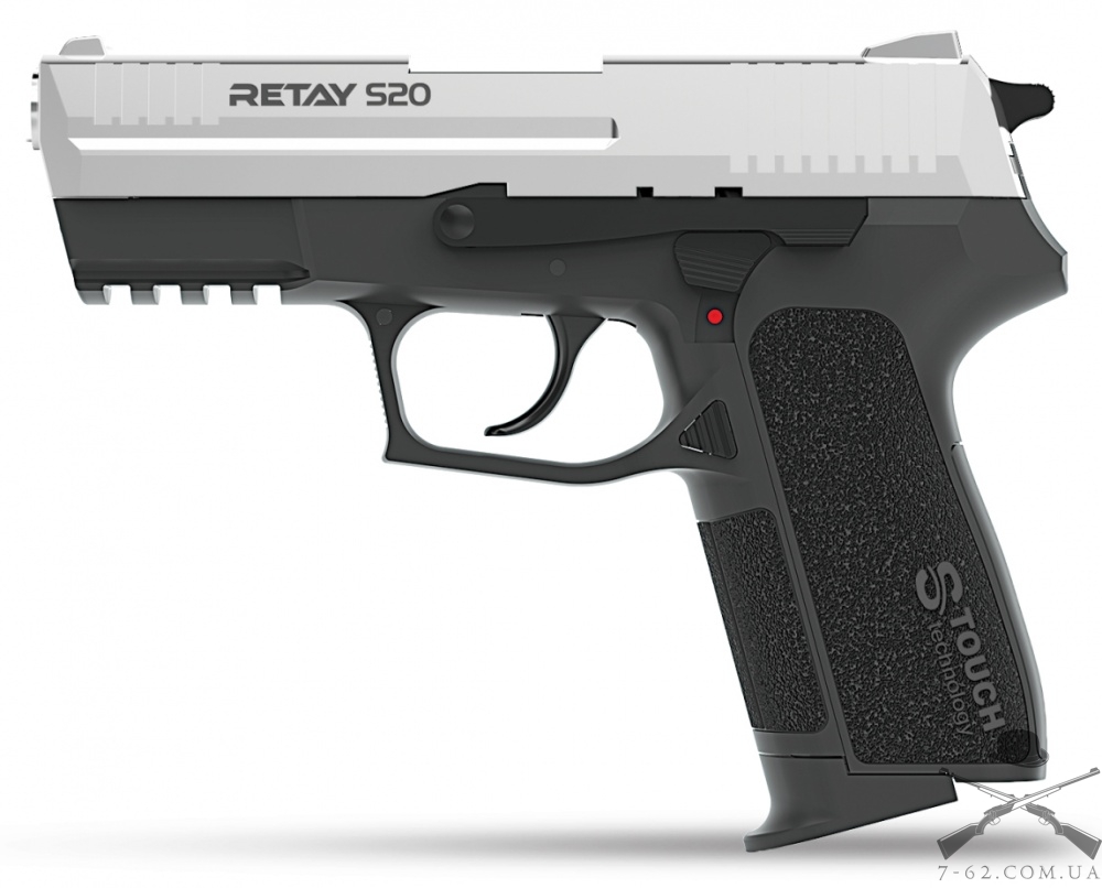 Пістолет сигнальний Retay S20 , Chrome - напівавтоматичний стартовий пістолет з УСМ подвійної дії, репліка Sig Sauer SP2022 . Текстурована поверхня рукояті, створена за новою технологією X-Touch , забезпечує більш якісне утримання, керованість та маневреність пістолета. Пістолет оснащений запобіжником прапорця і планкою Пікатінні.
