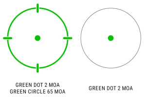 Коліматор також примітний електронним кнопковим управлінням яскравістю підсвітки та змінними прицільними сітками: точка (2 МОА) або точка 2 МОА у колі 65 МОА. Фірмовий світлодіод зеленого кольору Holosun's Super LED дуже комфортний для зору, гарантуючи при цьому максимальну зручність при наведенні на ціль. Технологія Shake Awake™ забезпечує до 50 000 годин роботи від одного заряду батареї, активуючи підсвітку під час вібрації та вимикаючи її при тривалому стані спокою.